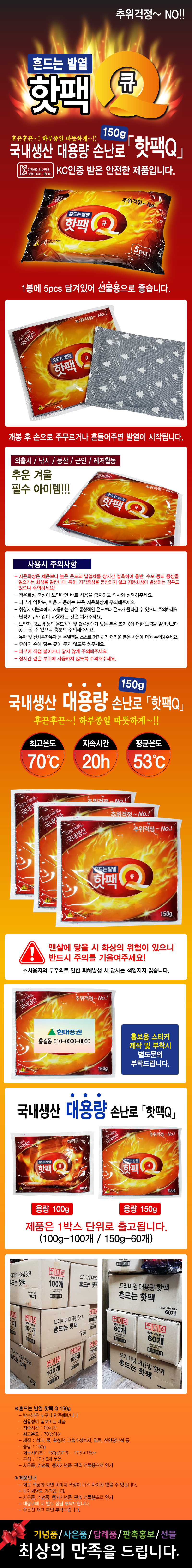 (대용량 국산) 흔드는 손난로 발열 핫팩Q-150g / 홍보용 스티카 부착시 문의 !!