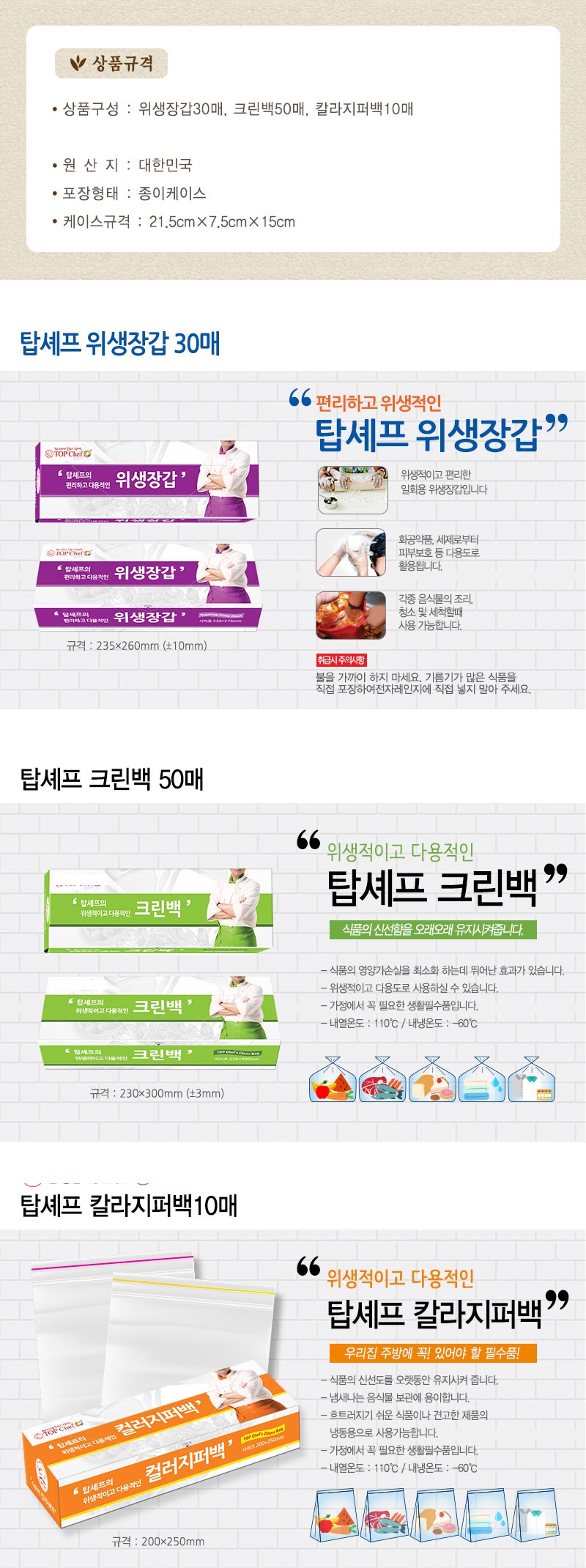 위생장갑 크린백 칼라지퍼백 3종