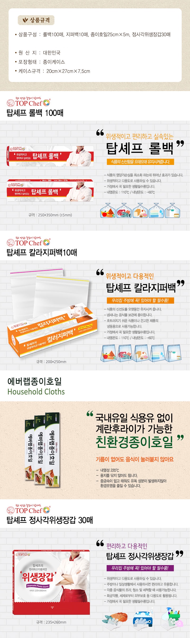 롤백100매 칼라지퍼백 종이호일5m 정사각위생장갑 4종