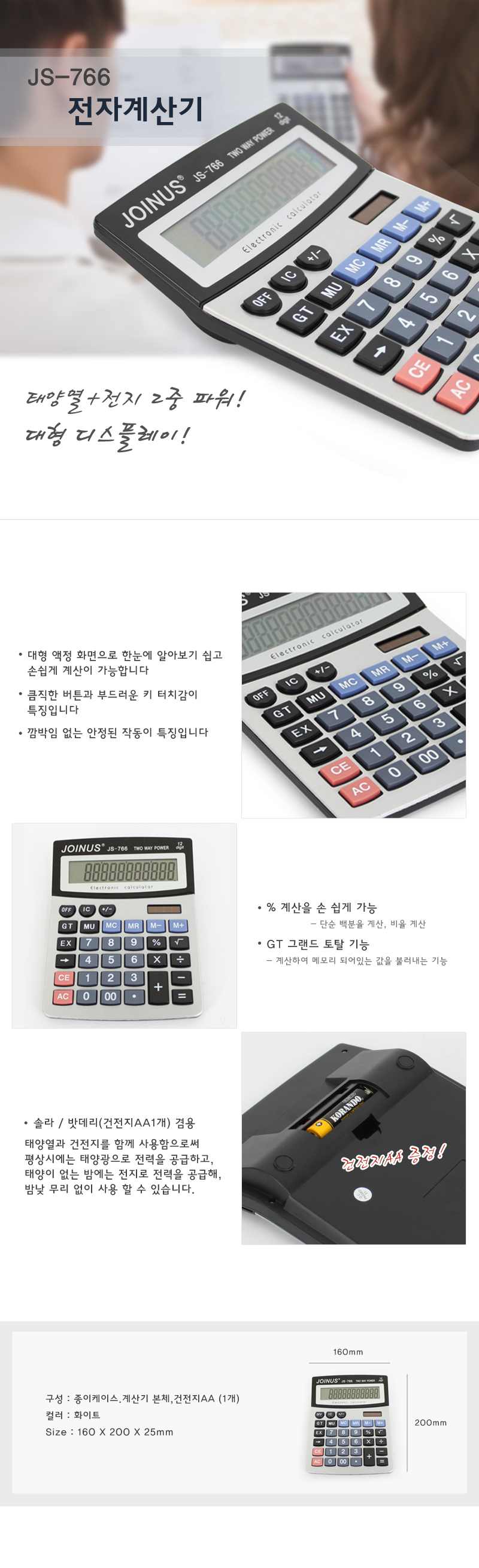 오리지날 솔라 계산기로 2Way방식으로 건전지로도 사용이 가능 합니다