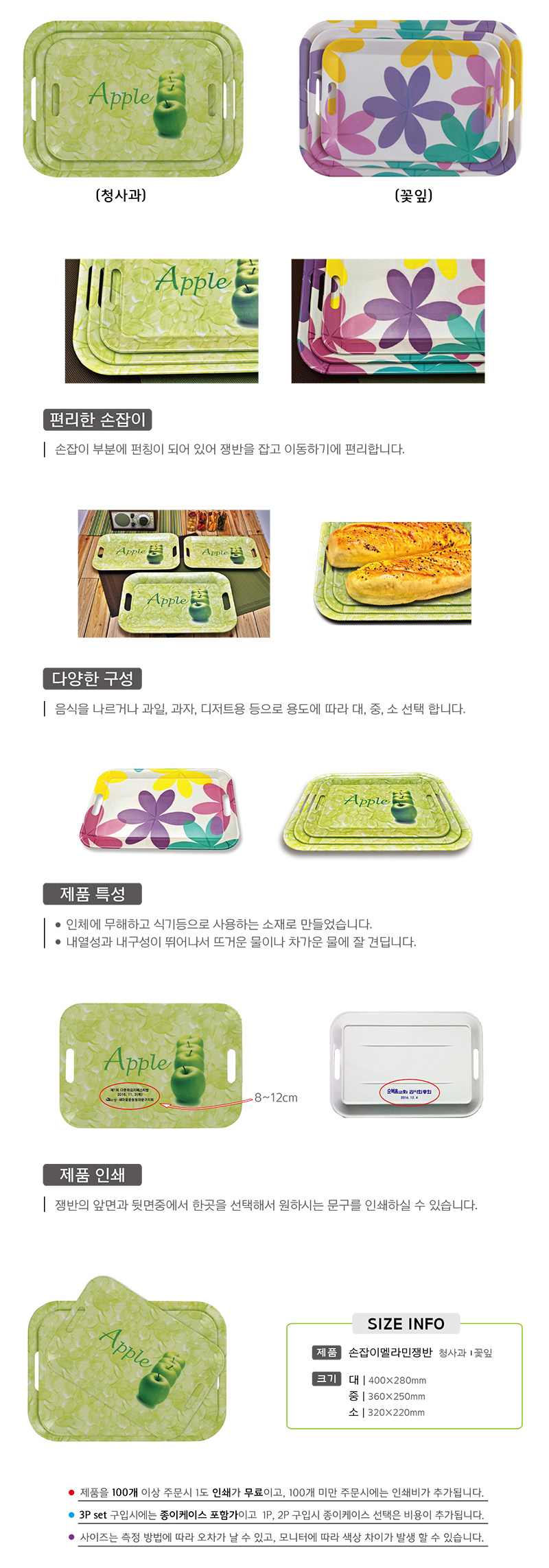 손잡이 멜라민쟁반(청사과꽃잎) 3P