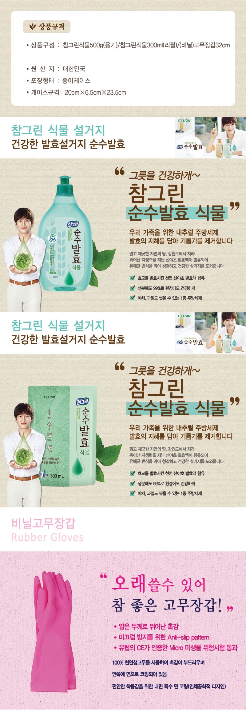 구성 : 참그린식물500g(용기)/참그린식물300ml(리필)/비닐고무장갑32cm