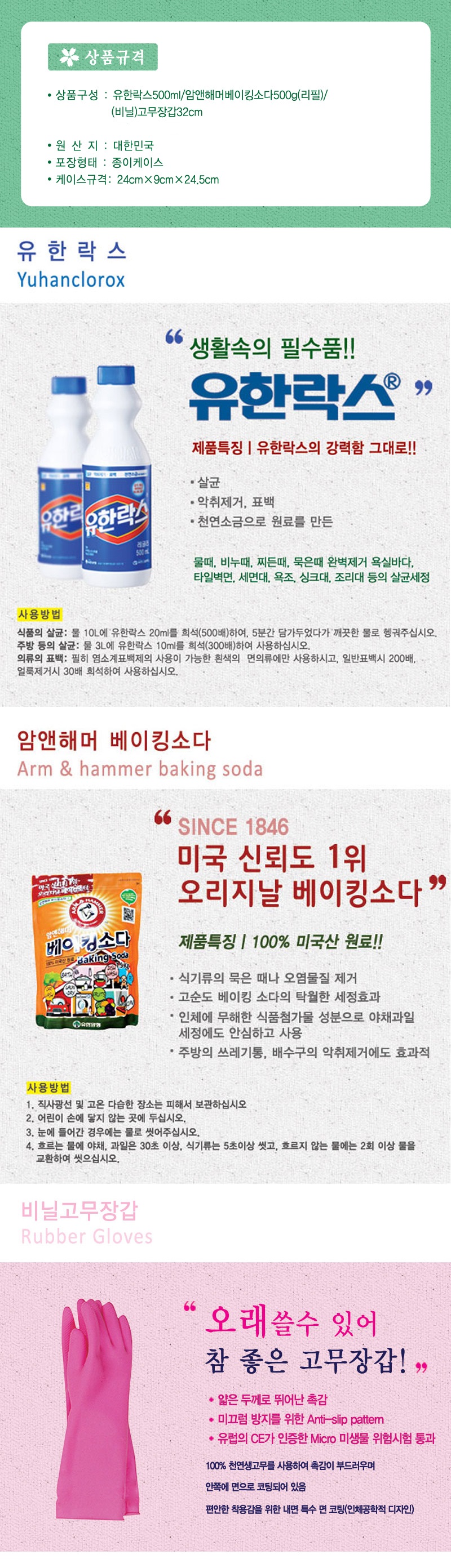 구성 : 유한락스500ml/암앤해머베이킹소다500g(리필)/비닐고무장갑32cm
