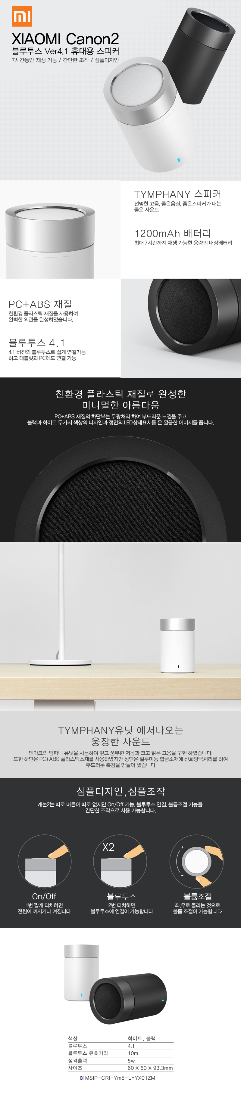 포터블스피커 / 5W / 4Ω / 전화통화 / 블루투스 / ver 4.1 / A2DP / AVRCP / SBC / 10m / 내장배터리 / 1,200mAh / 전원포트:micro5핀 / 재생시간:약 7시간 / 배터리용량:1200mAh