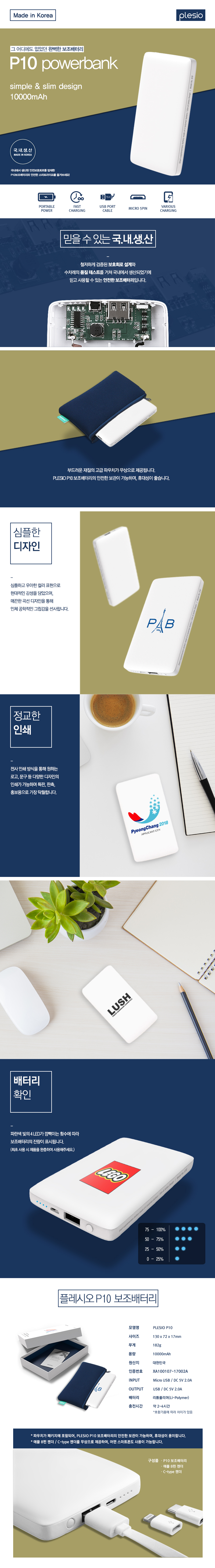 [국산] 플레시오 P10 보조배터리 10000mAh(파우치증정)
