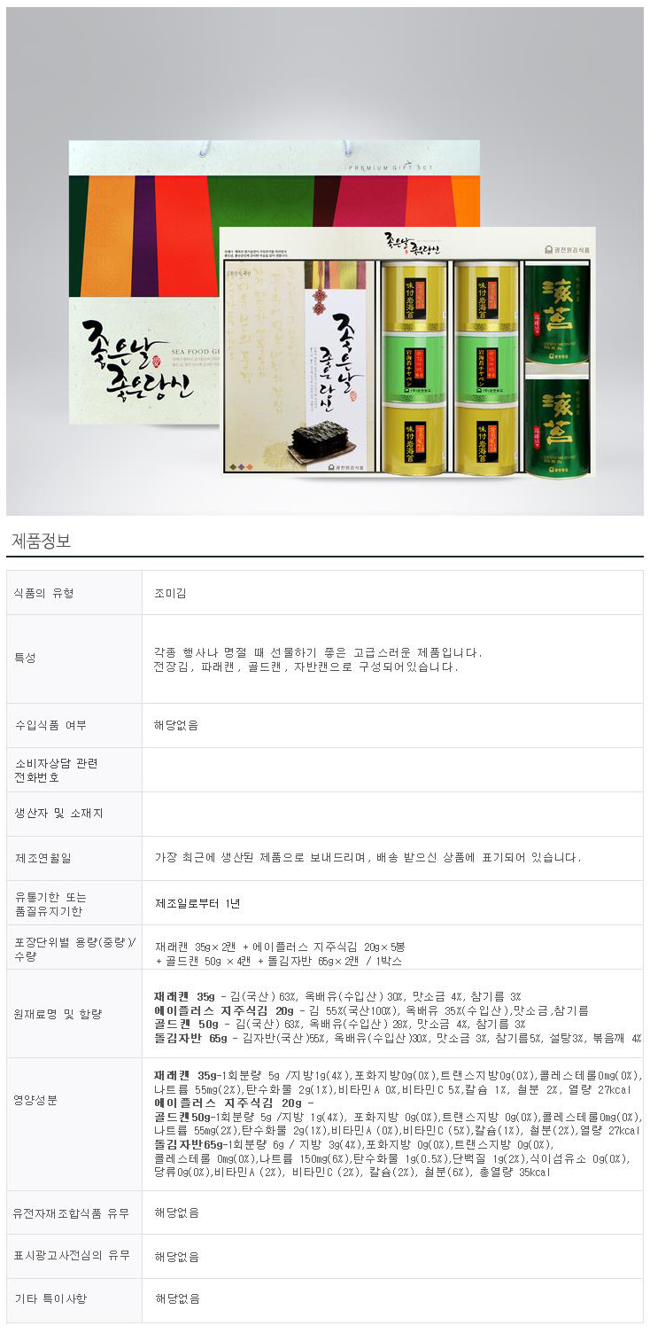 지주식전장(20g)5봉+파래캔(35g)2캔+돌김캔(50g)4캔+자반캔(65g)2캔